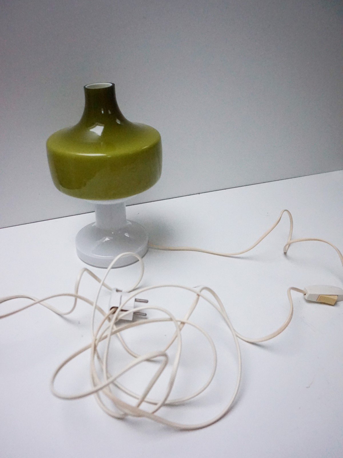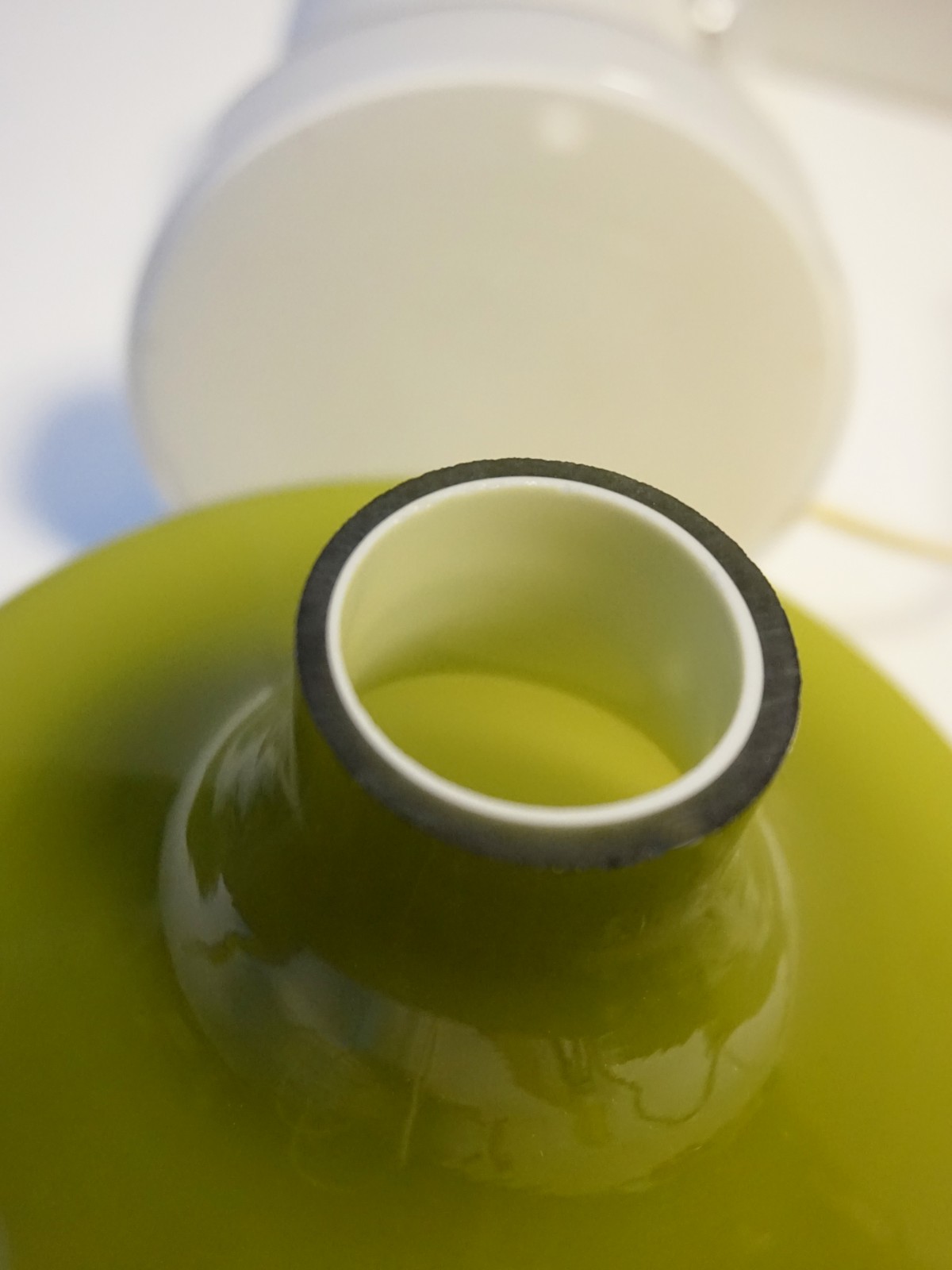 The base is made of white milk glass and the lampshade is in green glass with white glass on the inside which gives it a beautiful, deep, layered and subdued color