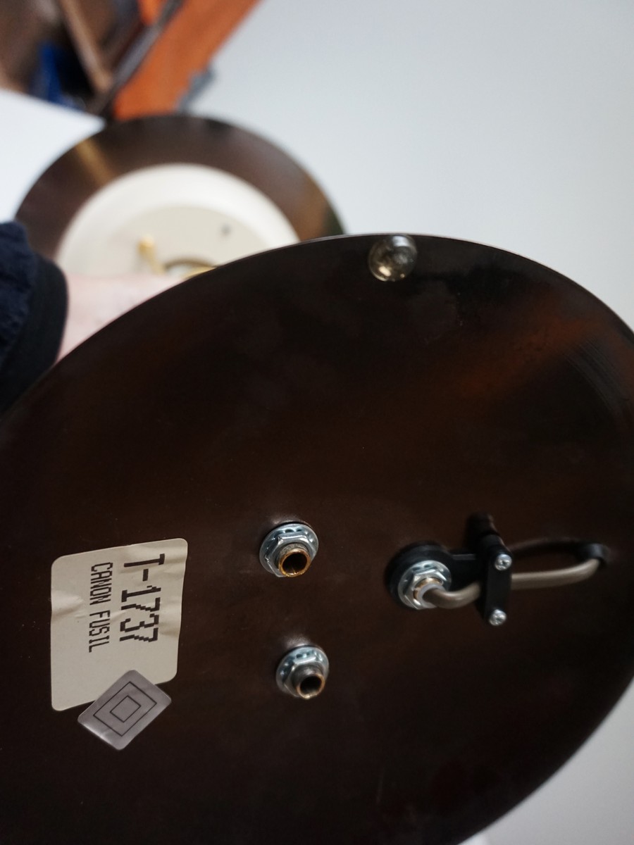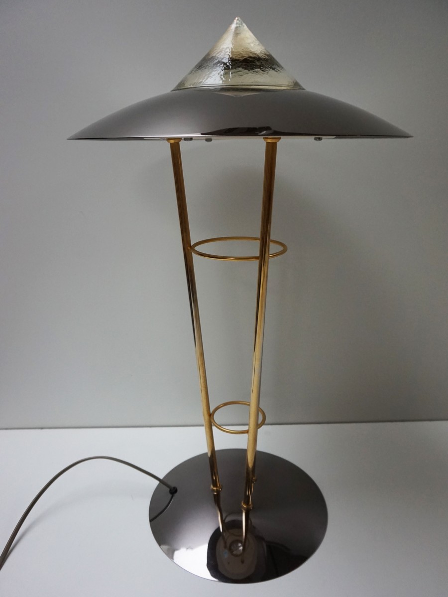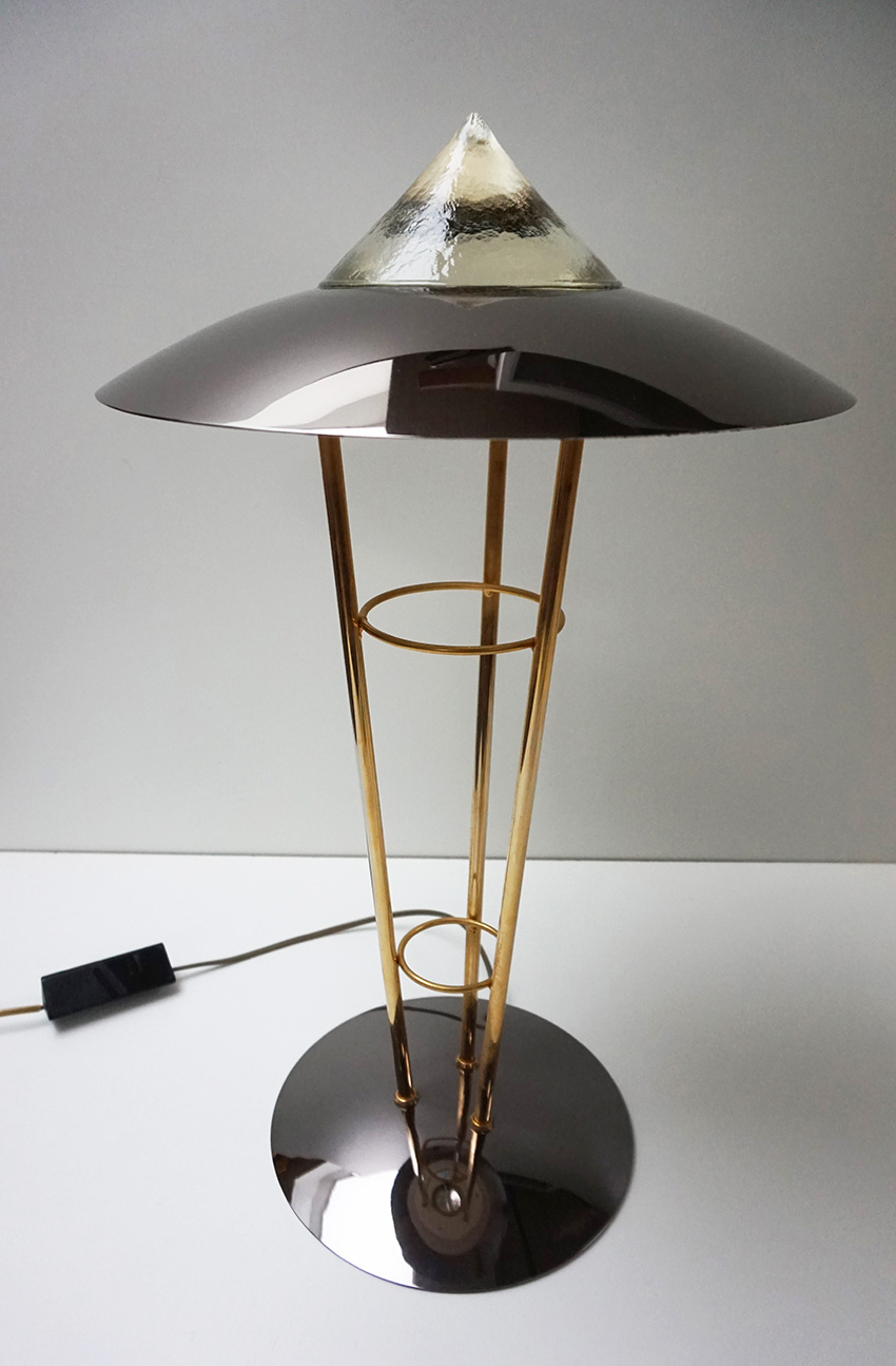 Beautiful conical table lamp made of metal in dark chrome with 3 slender brass legs in a warm yellow gold color, which creates a beautiful contrast.