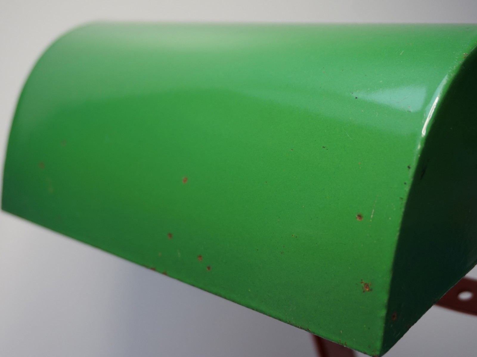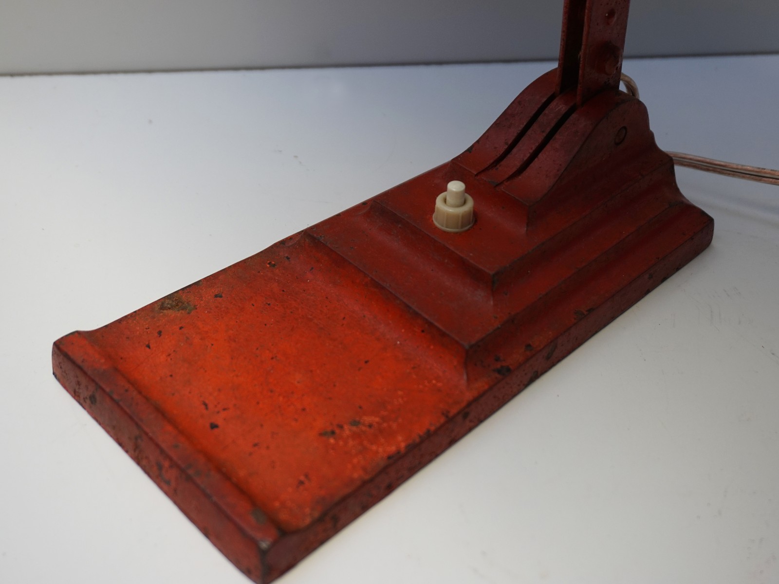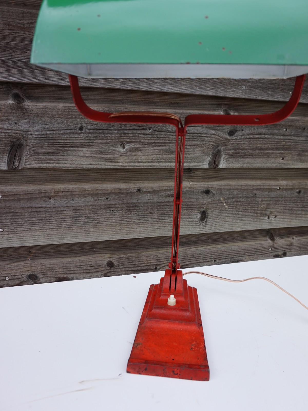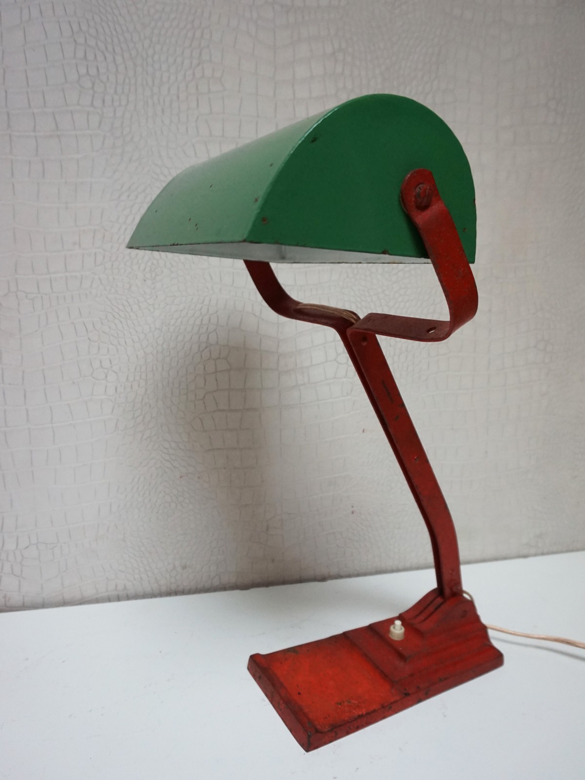This desk lamp, also called notary lamp or banker's lamp, is an early design by Erpe in the rare colors bright green and red, circa 1925.