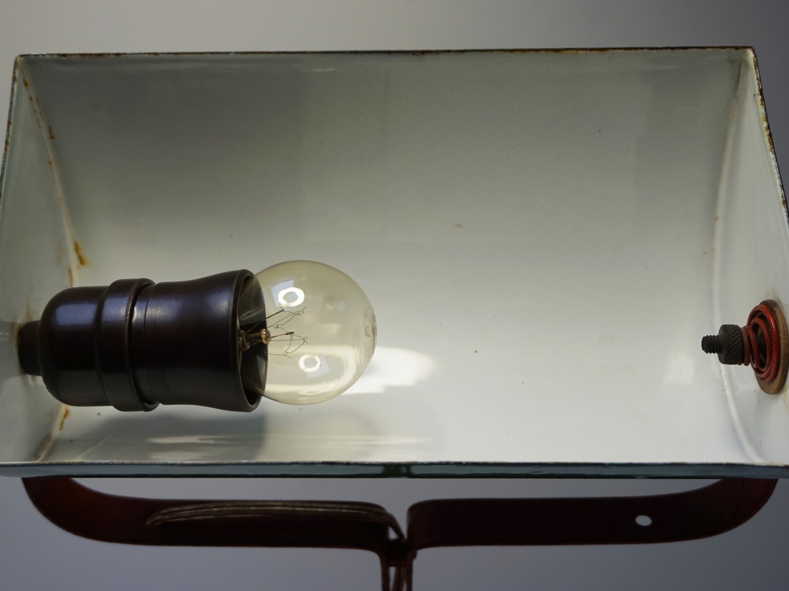 The enamel shade is adjustable and the lamp stands on a cast iron base. Working with light age-related traces. E27 fitting.