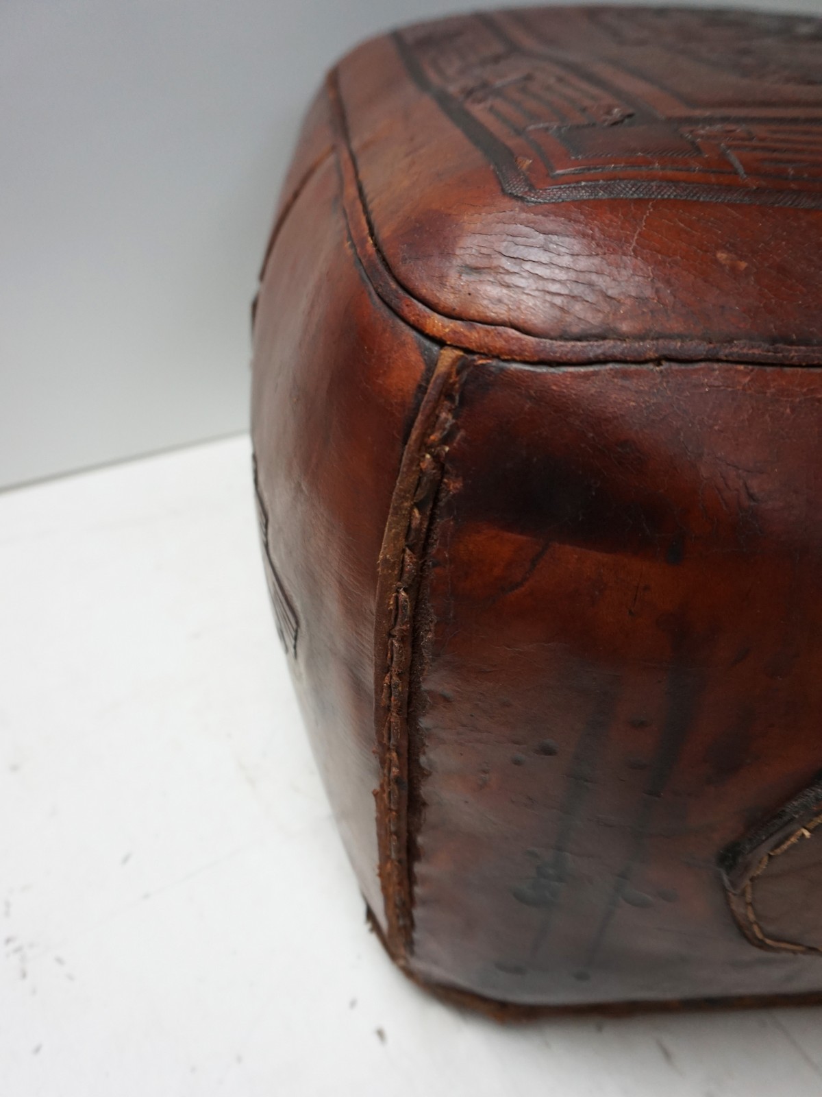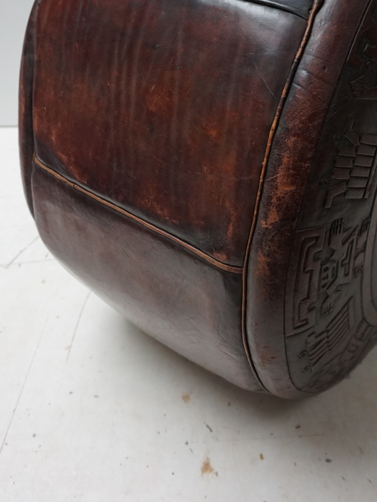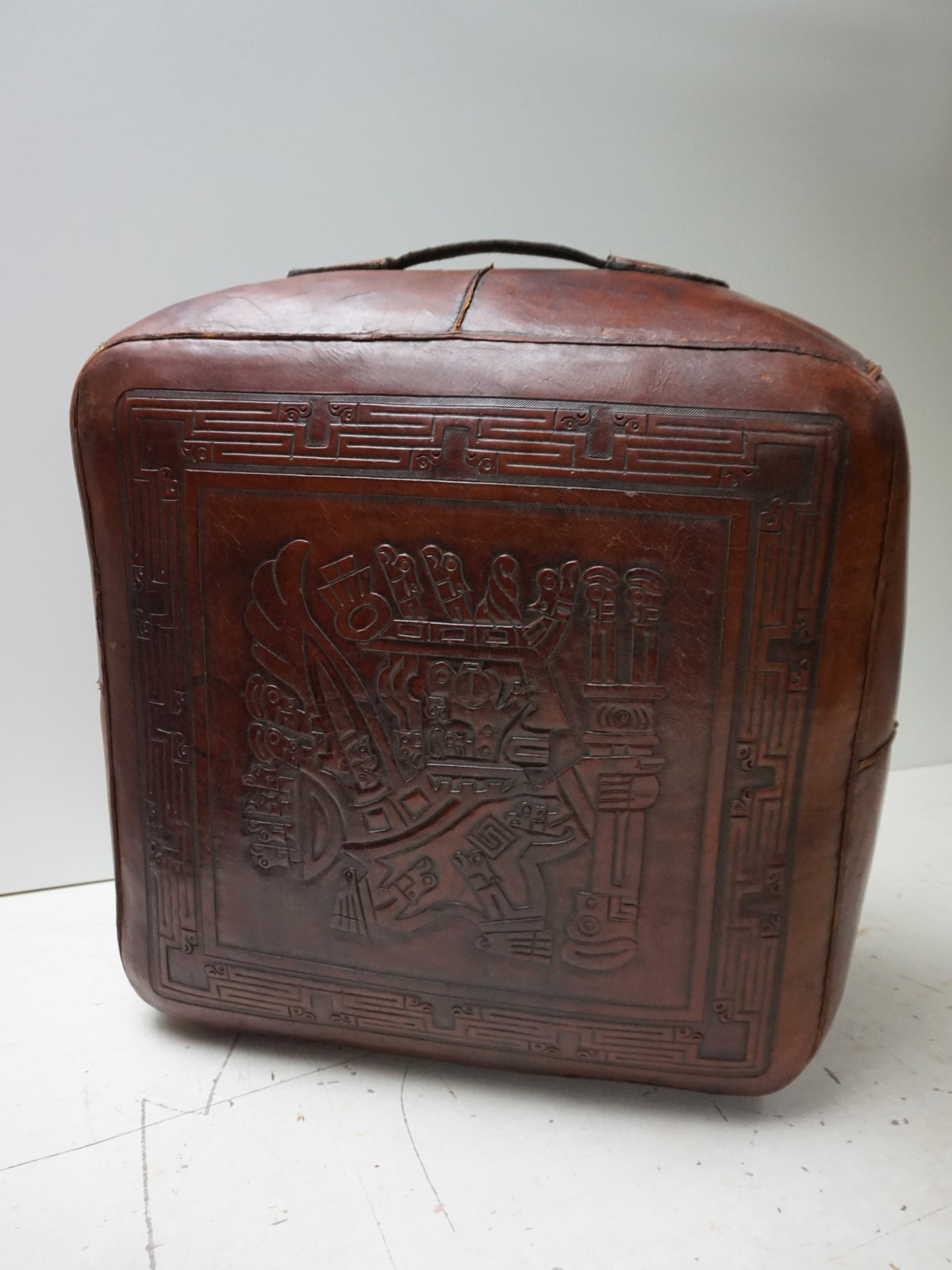 Beautiful and intricate saddle leather hand-tooled embossed with Maya -inspired decorations by Angel Pazmino for Meubles de Estilo in Ecuador, Central America in the 1970s