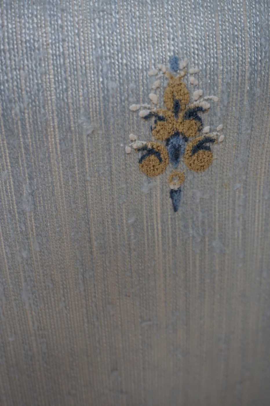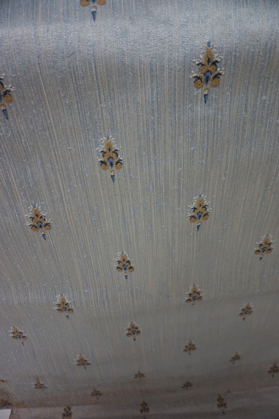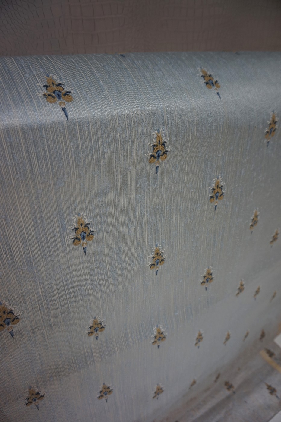 Zachte licht blauwe kleur met een prachtige zijdeachtige glans met een contrast van een fluwelen flock van motief in blauw, okergeel en wit