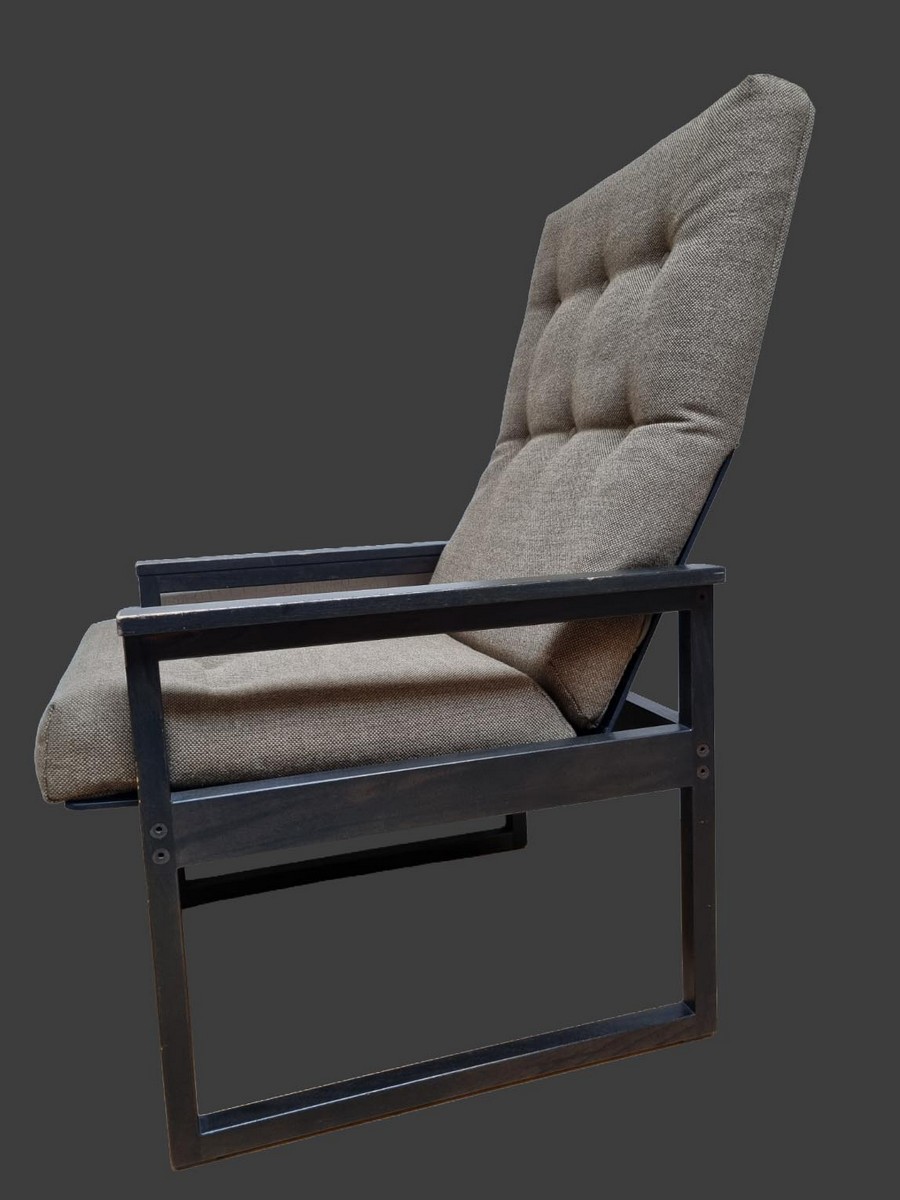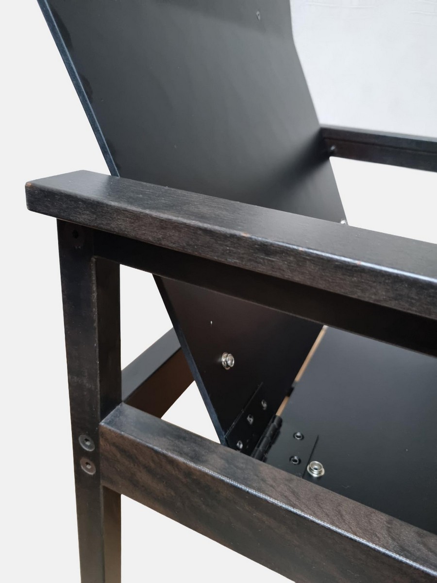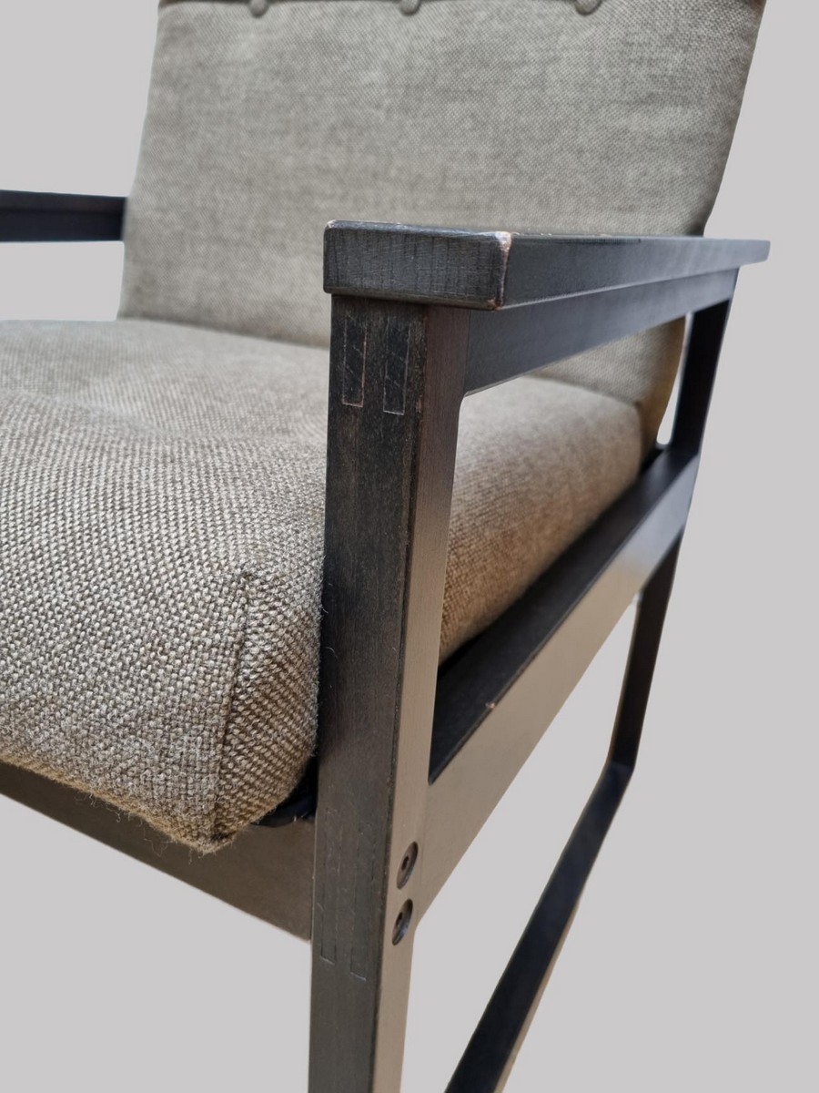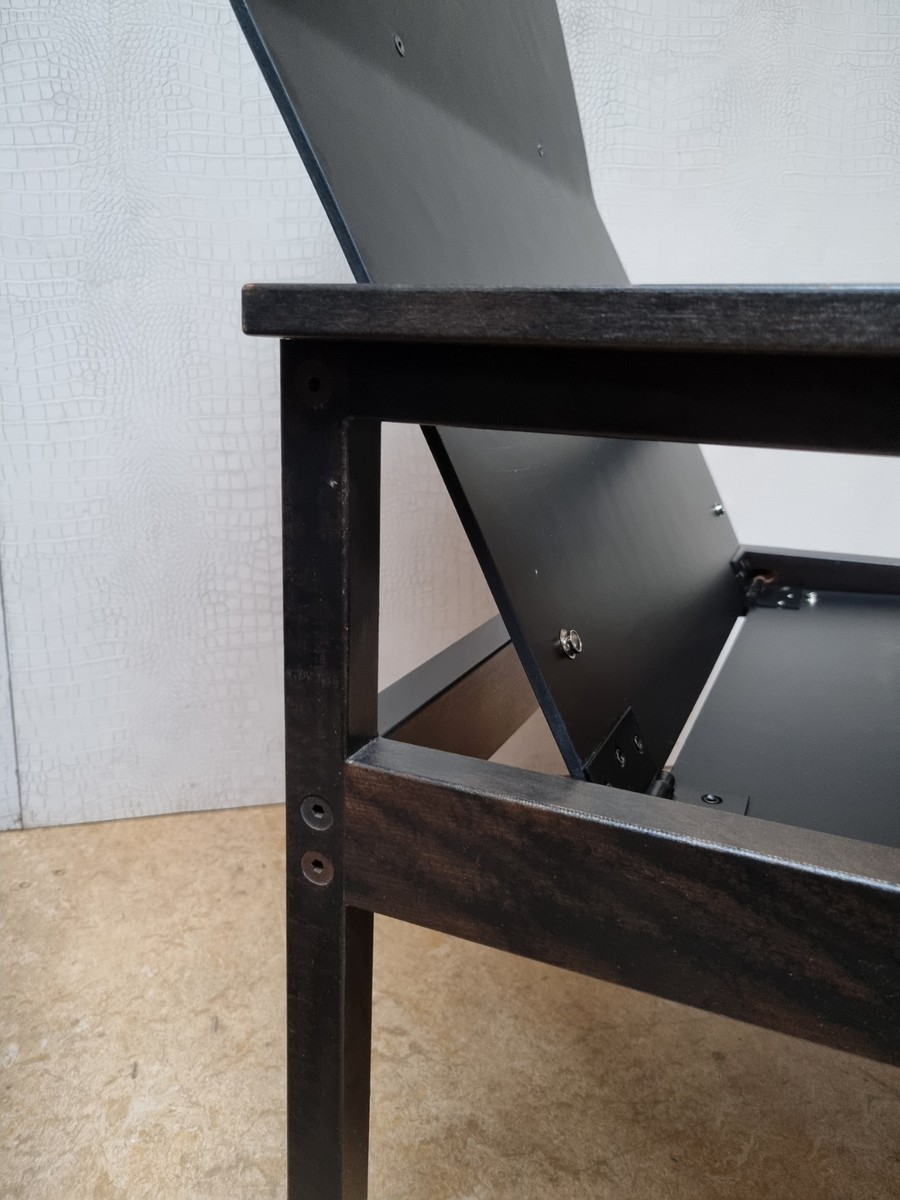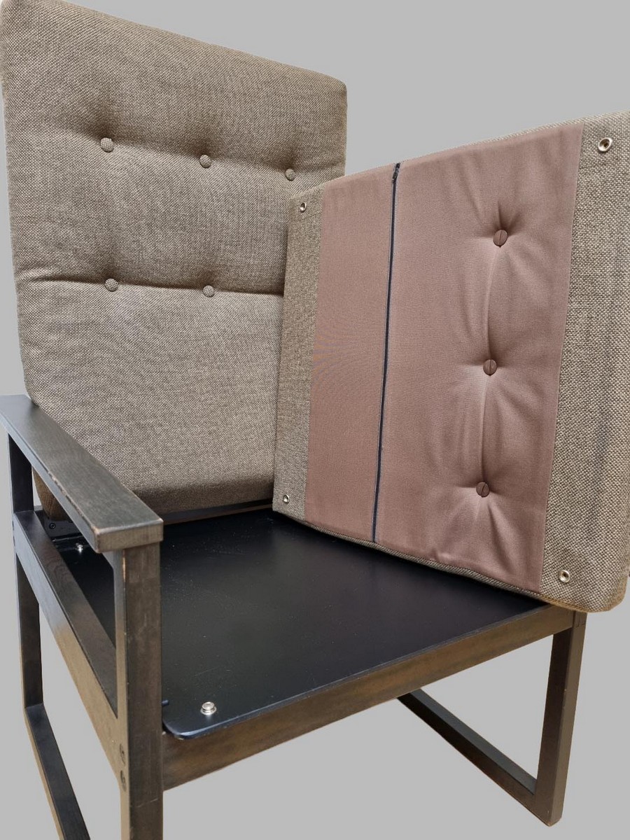 De zitting en rugleuning is gemaakt van zwart gelakt geperst hout en heeft losse zit- en rugbekleding van gemeleerd beige/bruine wollen stof welke met druk knopen bevestigd worden.