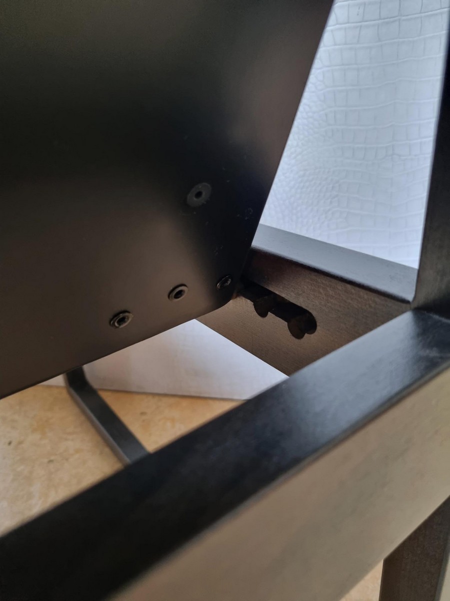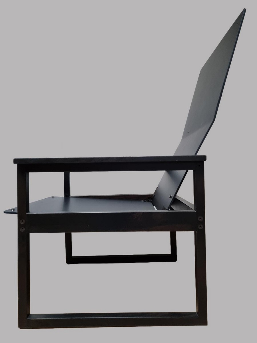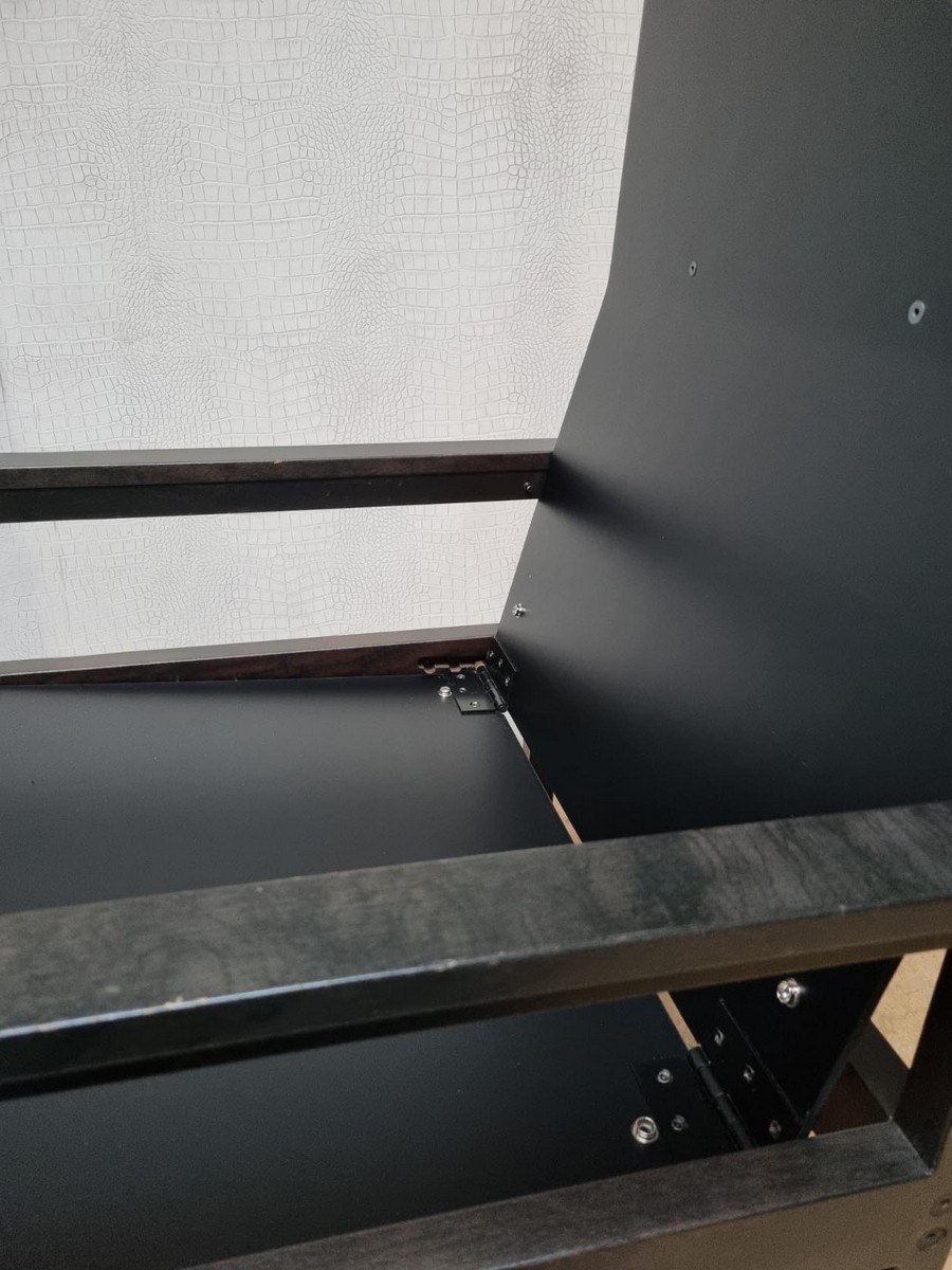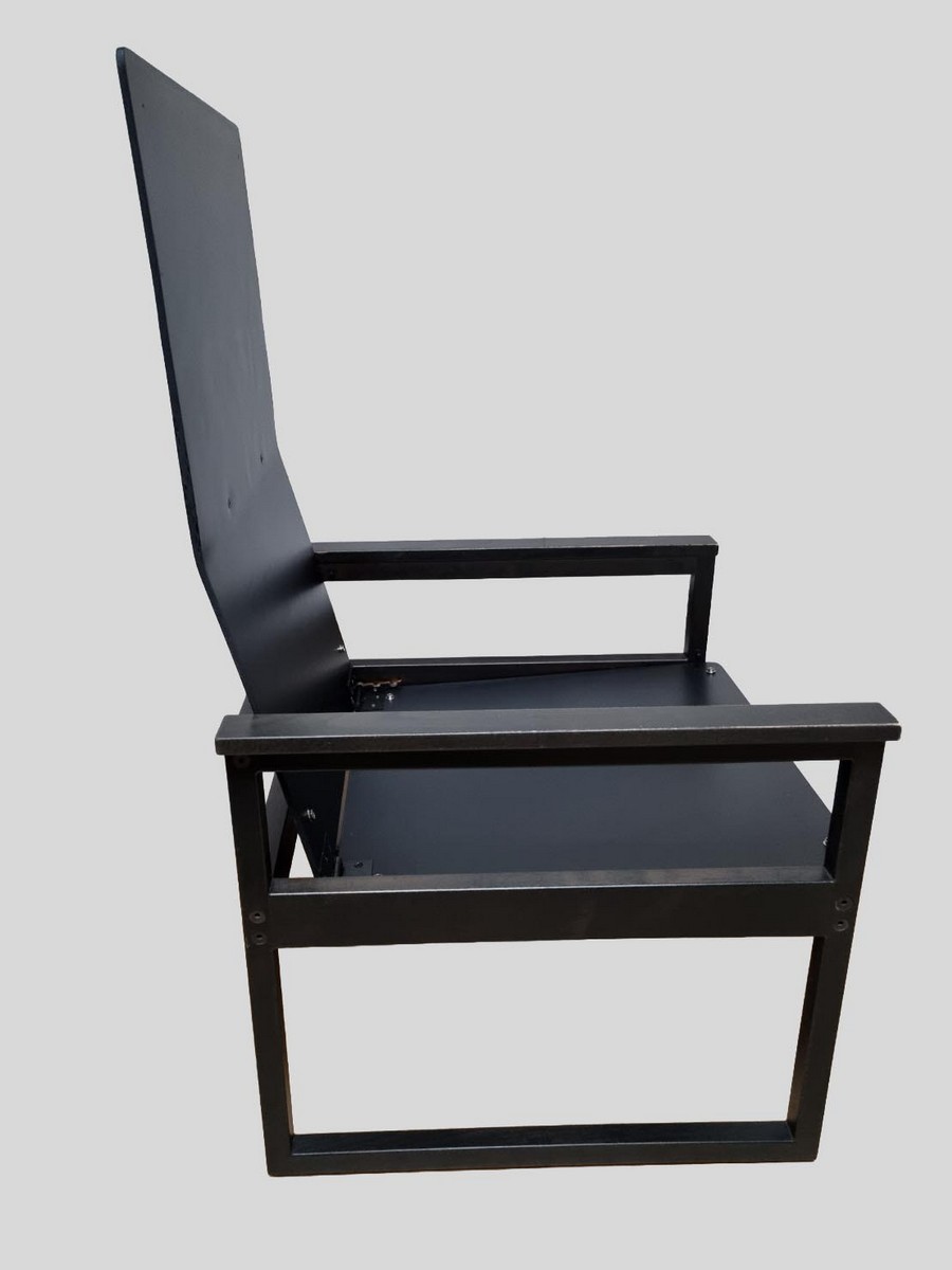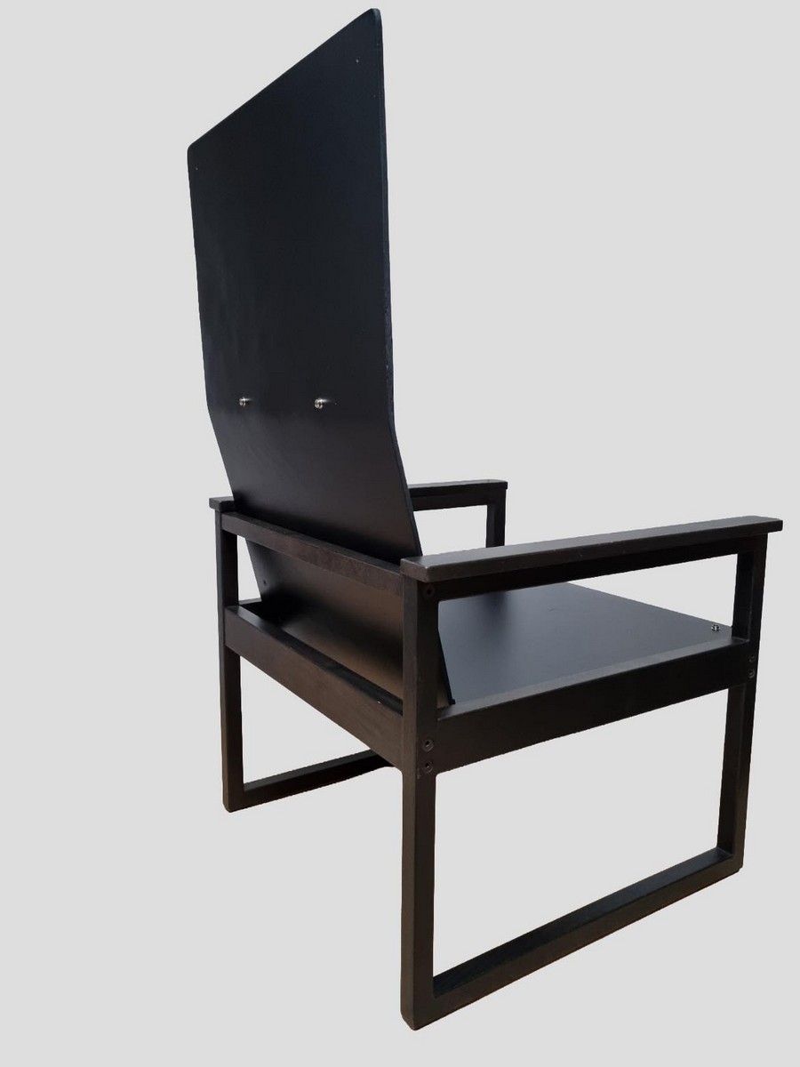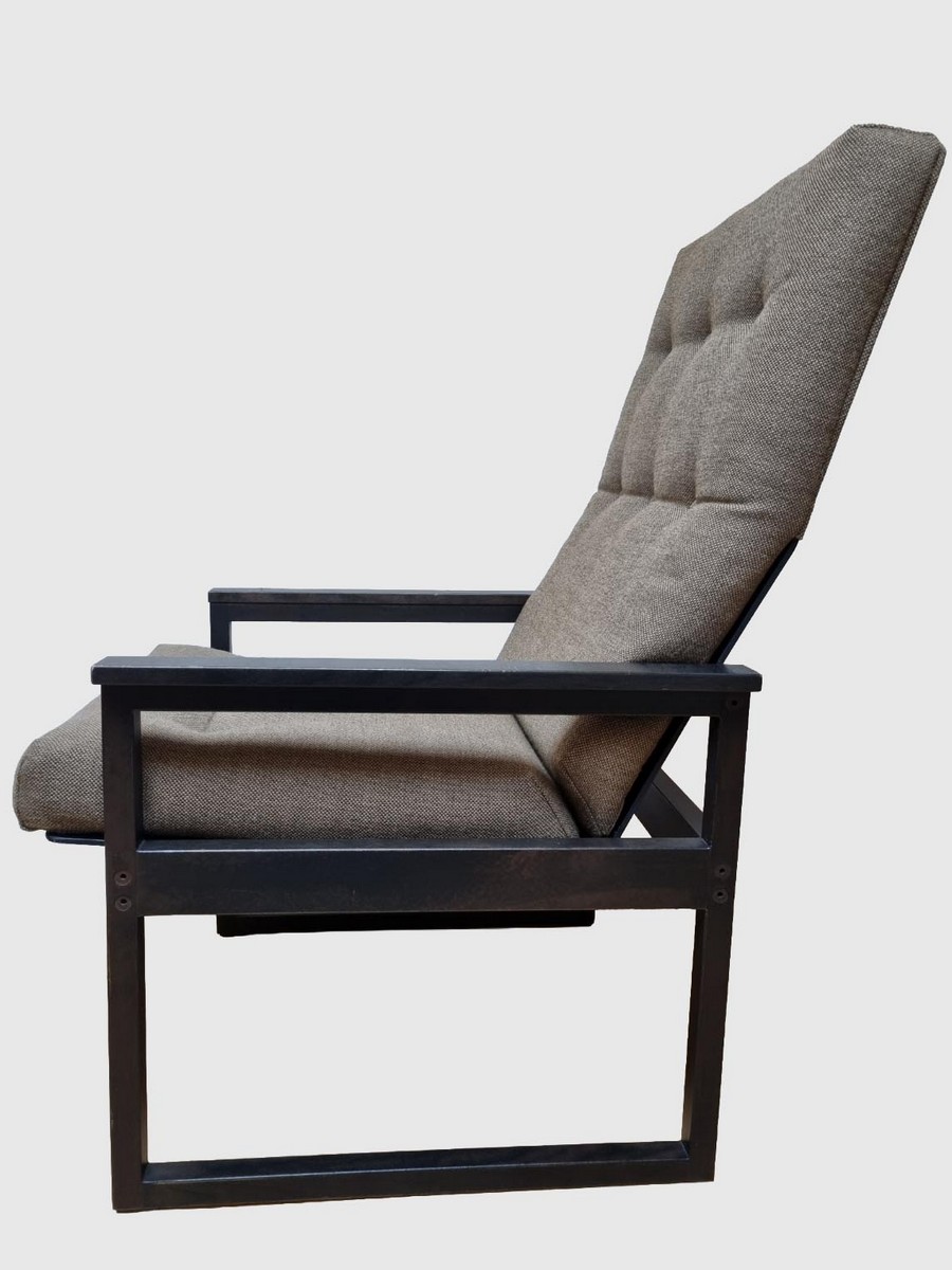 De zitting en rugleuning is gemaakt van zwart gelakt geperst hout en heeft losse zit- en rugbekleding van gemeleerd beige/bruine wollen stof welke met druk knopen bevestigd worden.
