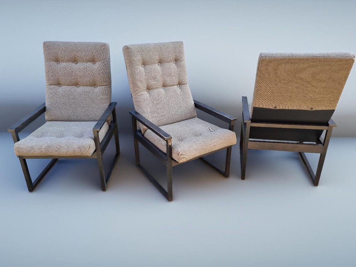 Wat lichte krasjes en slijtage op de armleuningen, de stof van alle drie de fauteuils zijn in een perfecte staat, zeer weinig gebruikt.