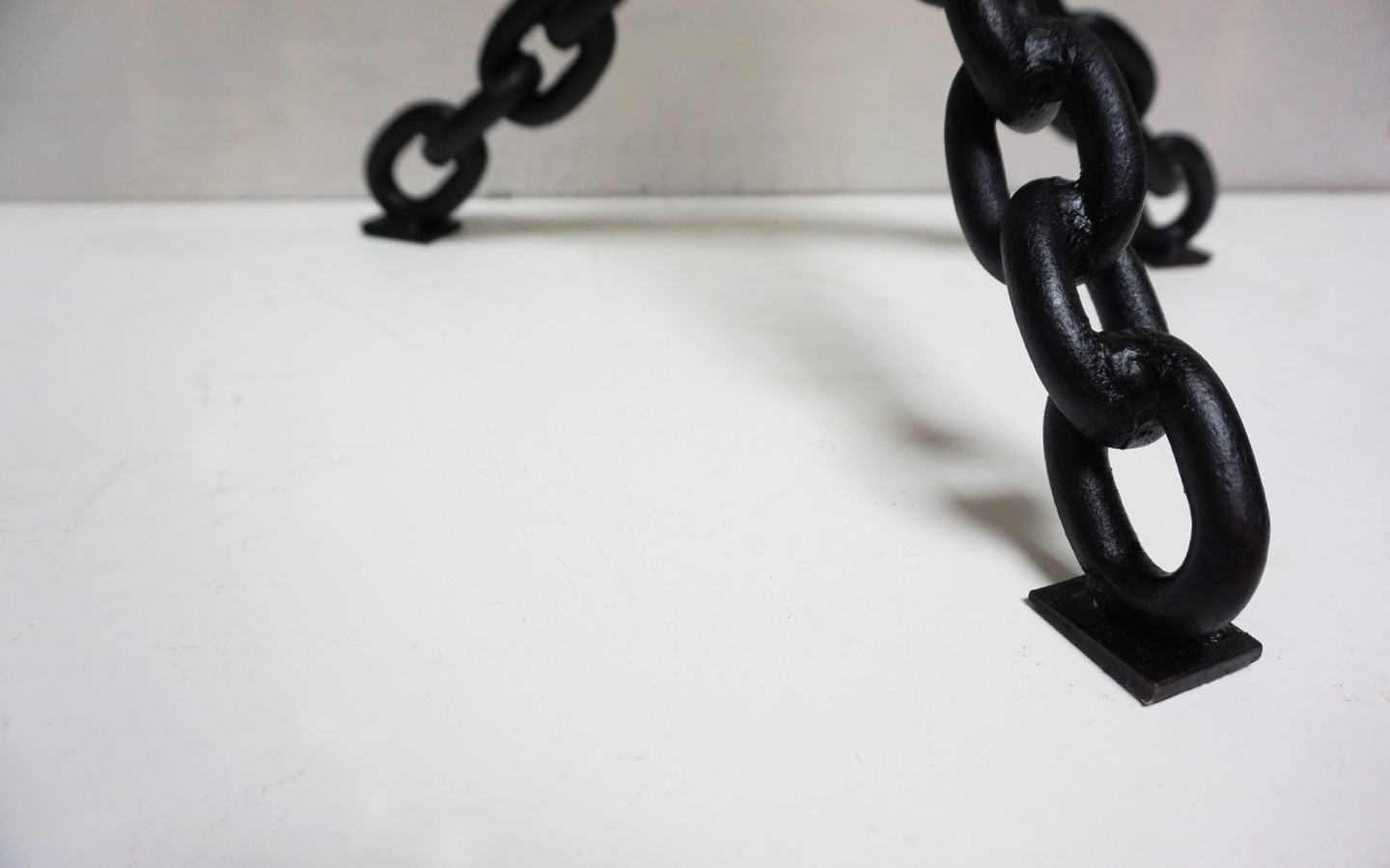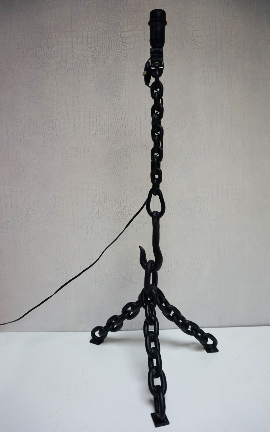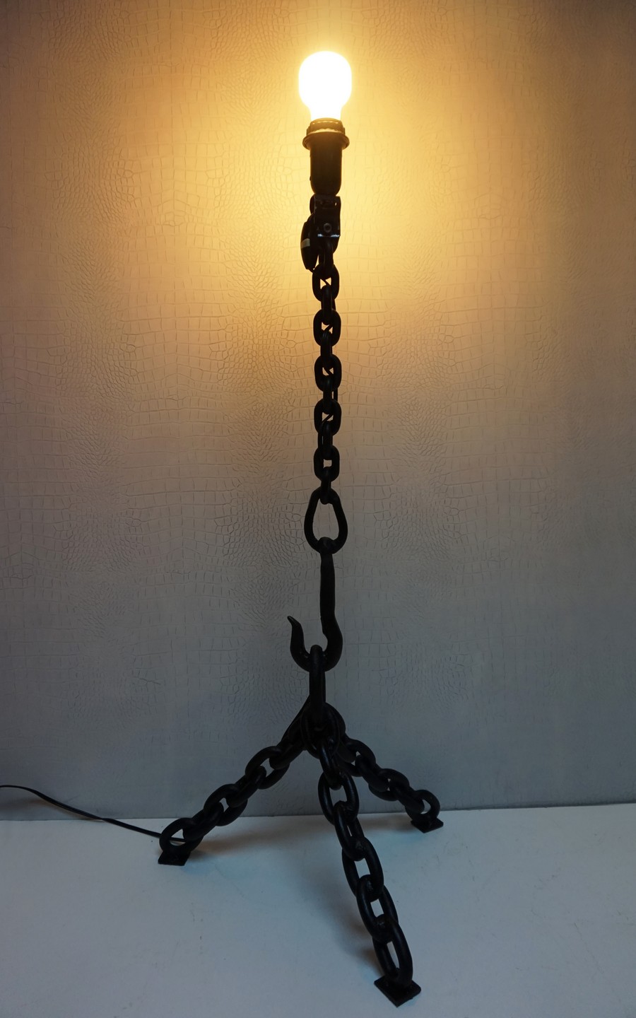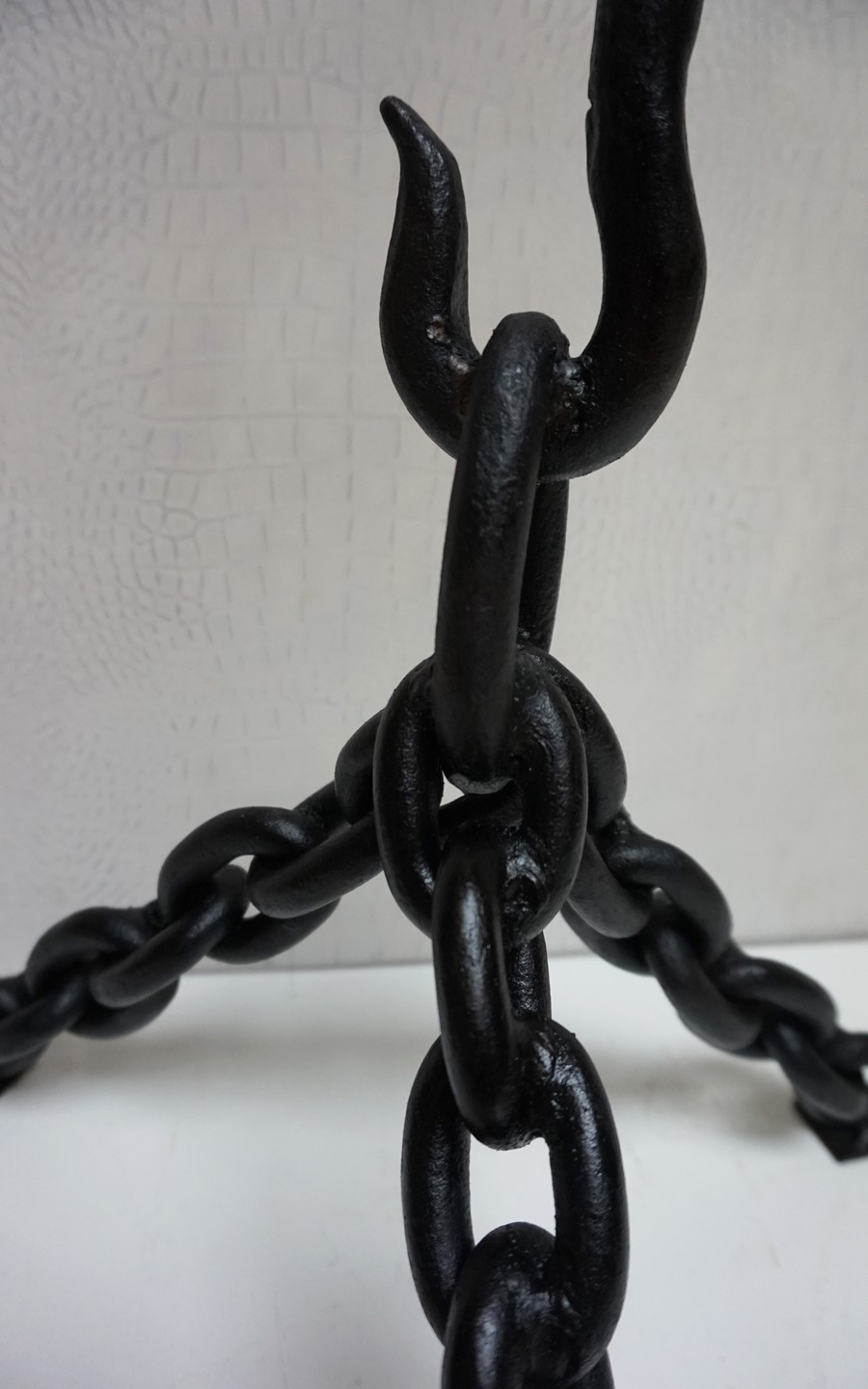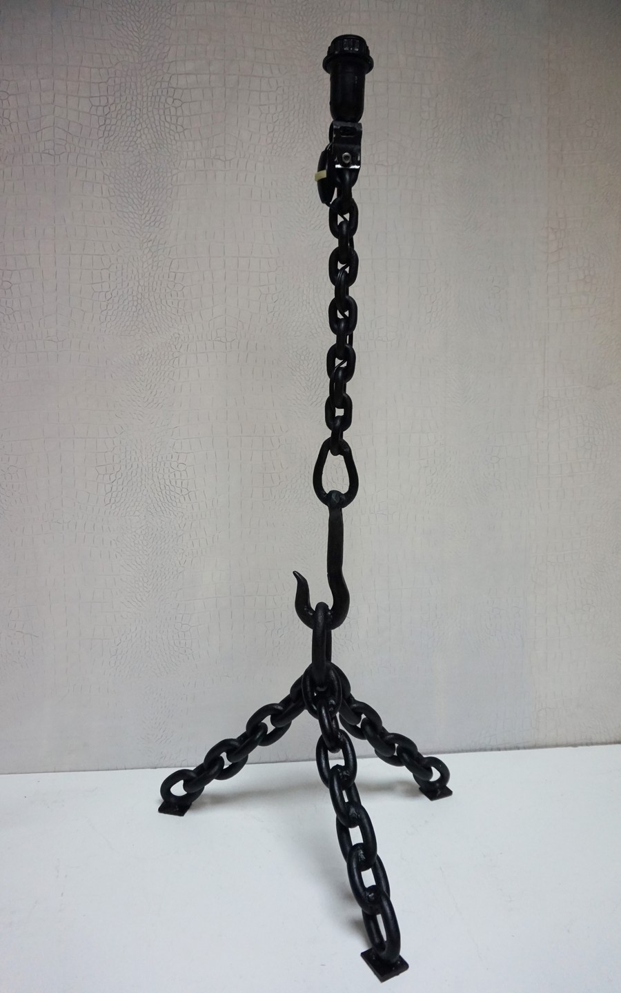 Deze unieke kettinglamp is handgemaakt van gelaste ijzeren kettingen met een mooi haak detail in het midden en in matzwart gelakt