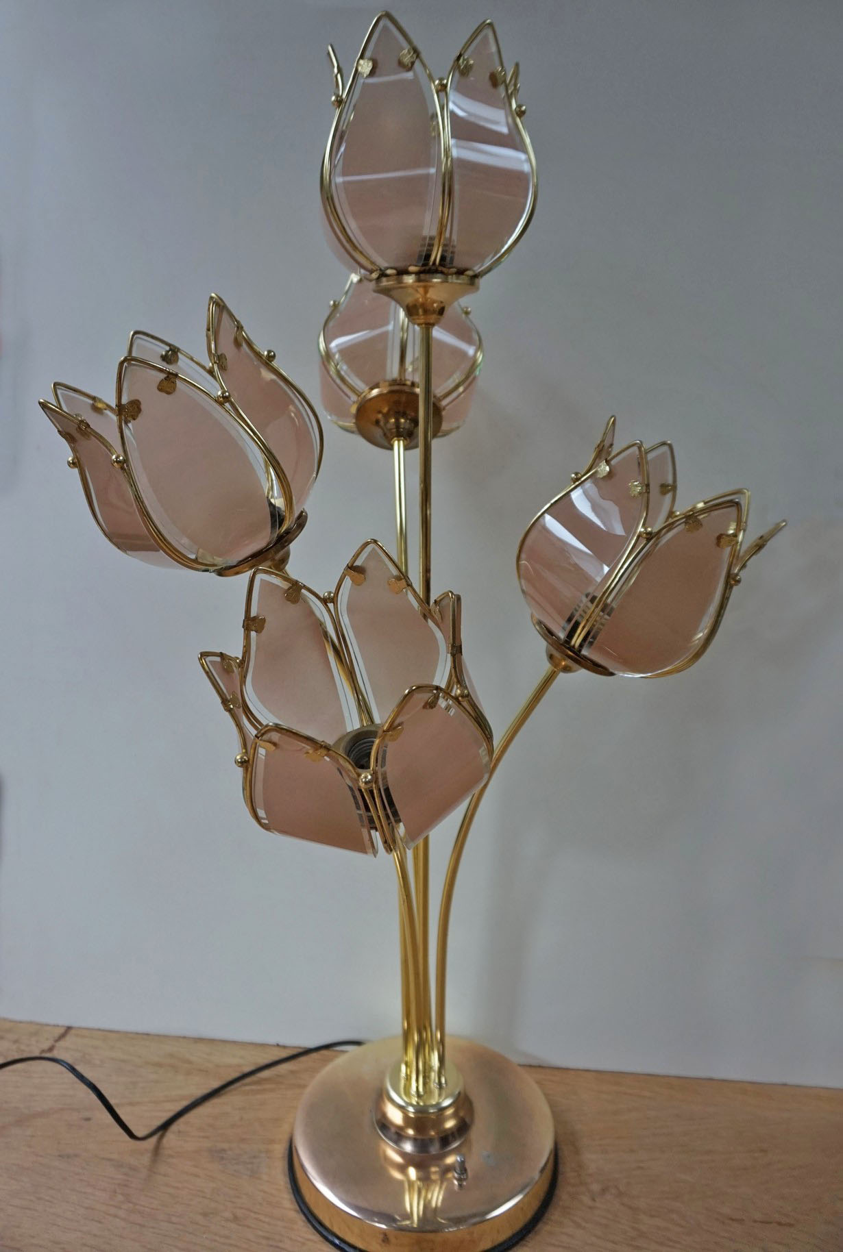 De lamp heeft een 5 prachtige roze tulp of lotus bloemen met een goudkleurigen messing voet