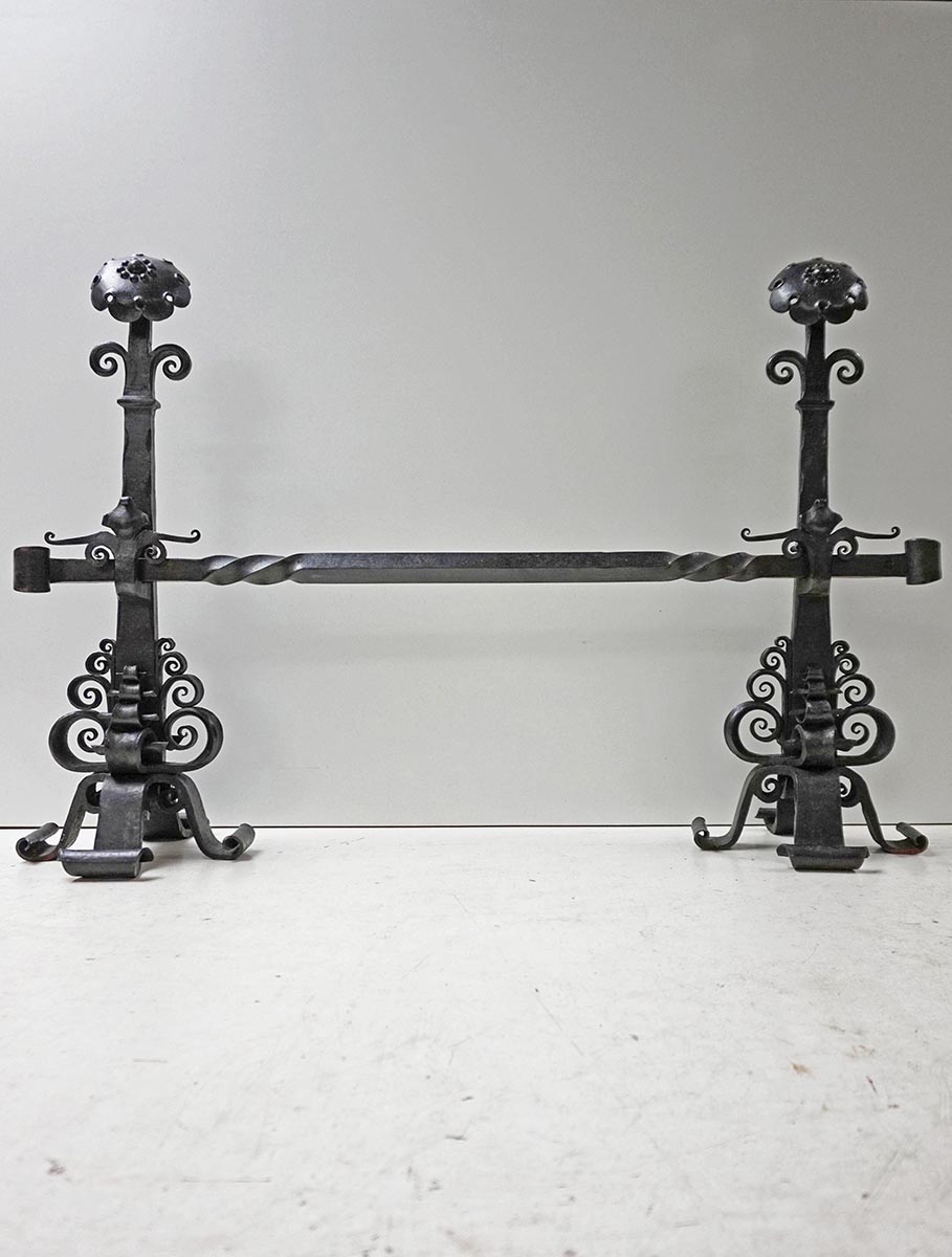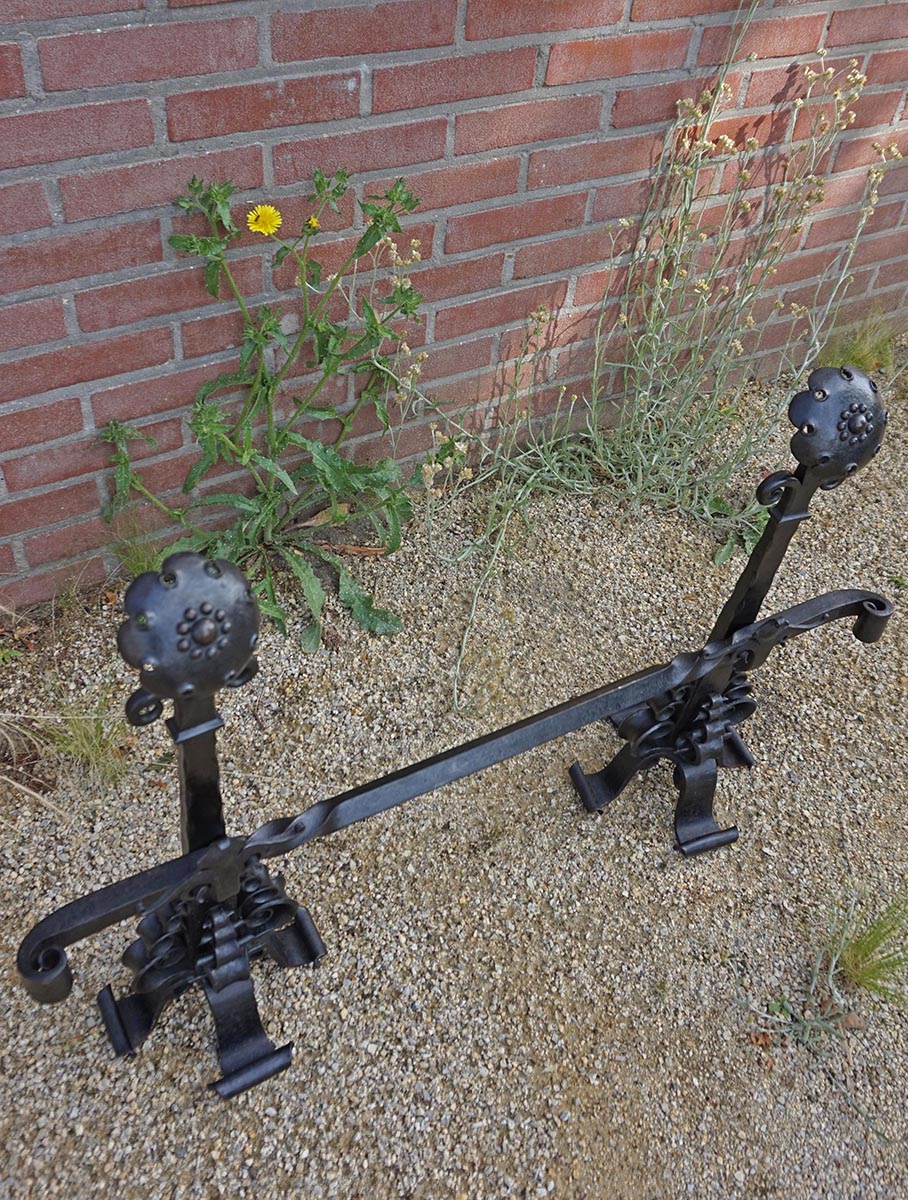 Smeedijzeren vuurbokken/ haardijzers met bijbehorende dwarsbalk