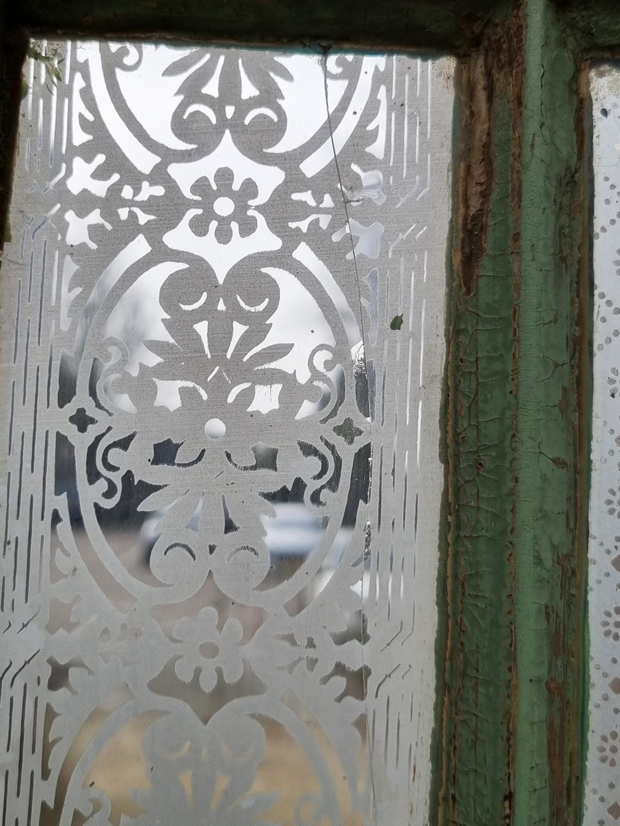 De lichtgroene deur heeft 2 stukken glas waar een barst in zit maar die stukken zitten verder nog wel stevig in het kozijn( zie foto's