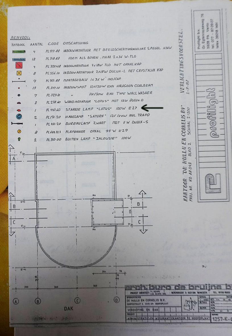 Deze specifieke vloerlamp werd oorspronkelijk gebruikt door een architect in een gebouw in Memphis-stijl dat in 1988 in Hoofdplaat, Nederland werd gebouwd. - Ik heb nog steeds de originele architectuur documenten van deze lamp van Profilight uit 1982 met de originele prijslijst van toen, zie foto's.