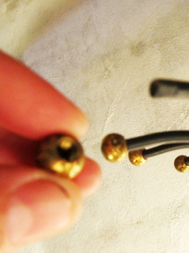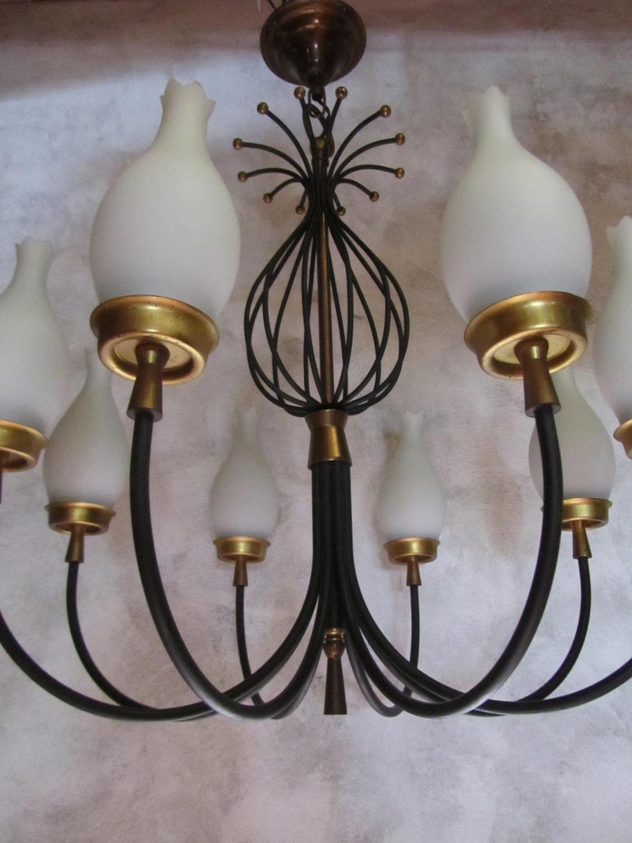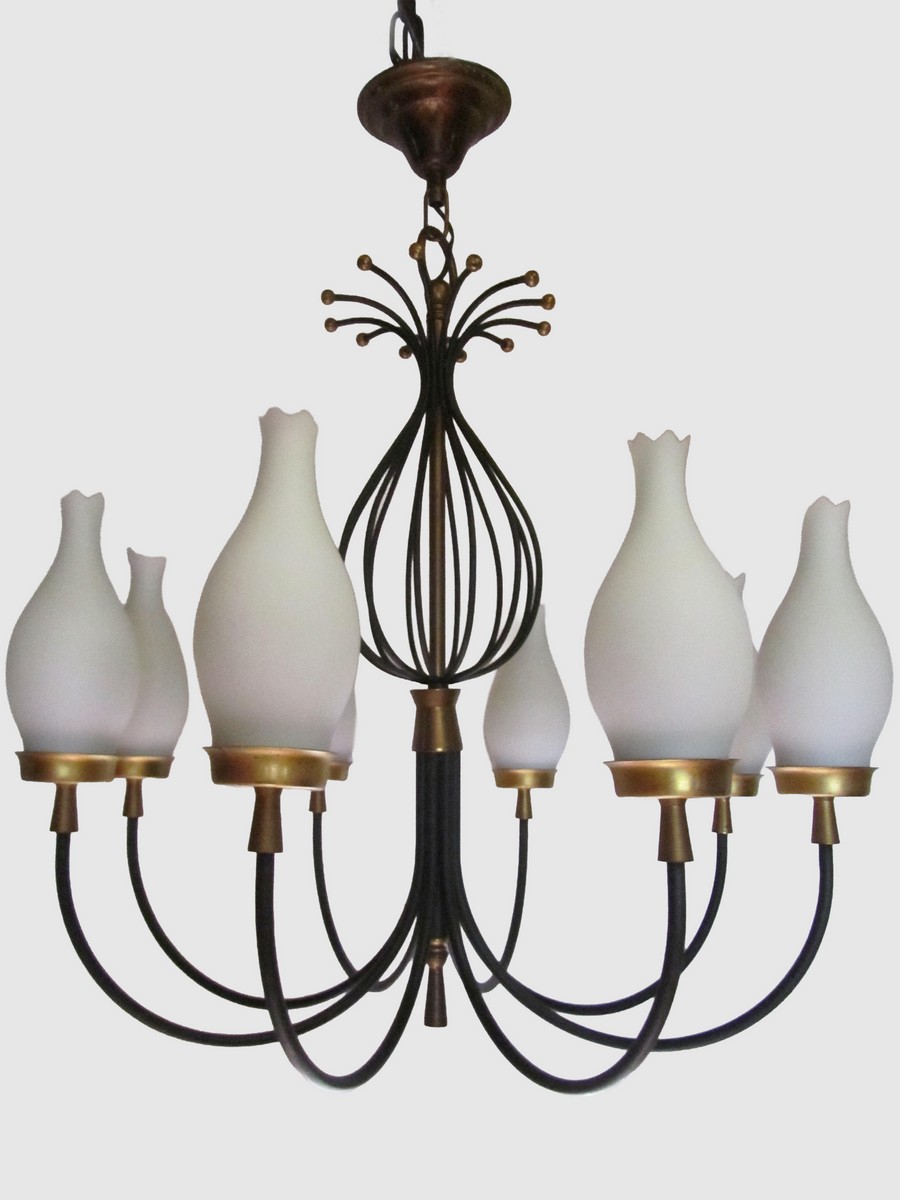 Een kwalitatief prachtig ontwerp. Let op het design van de lampenkappen welke een unieke soort van tulp achtige bovenkant heeft. Aan het uiteinde van de zwart metalen stangen zitten bronzen bolletjes welke eraf geschroefd kunnen worden