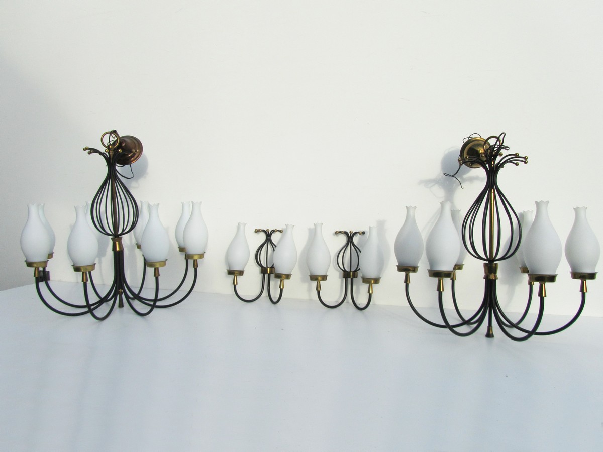 Set van 2 wandlampen met gesatineerde witte opalen glazen kappen, zwart gelakt metaal en messing, Italië, jaren 1950