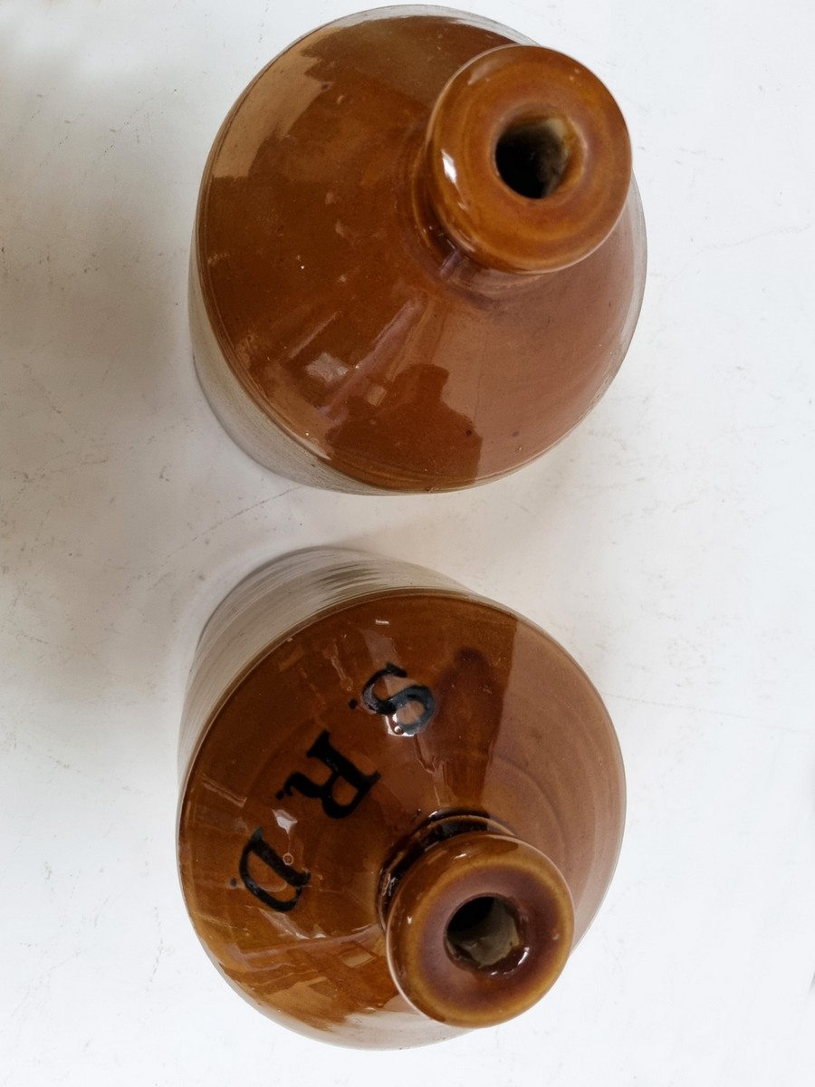 Set van 2 geglazuurde aardewerken Britse rum kruiken/flessen SRD, WOII, gemerkt 1944