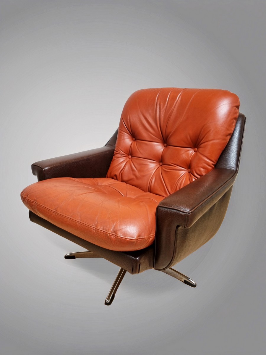 Geweldige jaren 70 draaifauteuil met een bruine skai kuip en een caramel/oranje leren kussen.